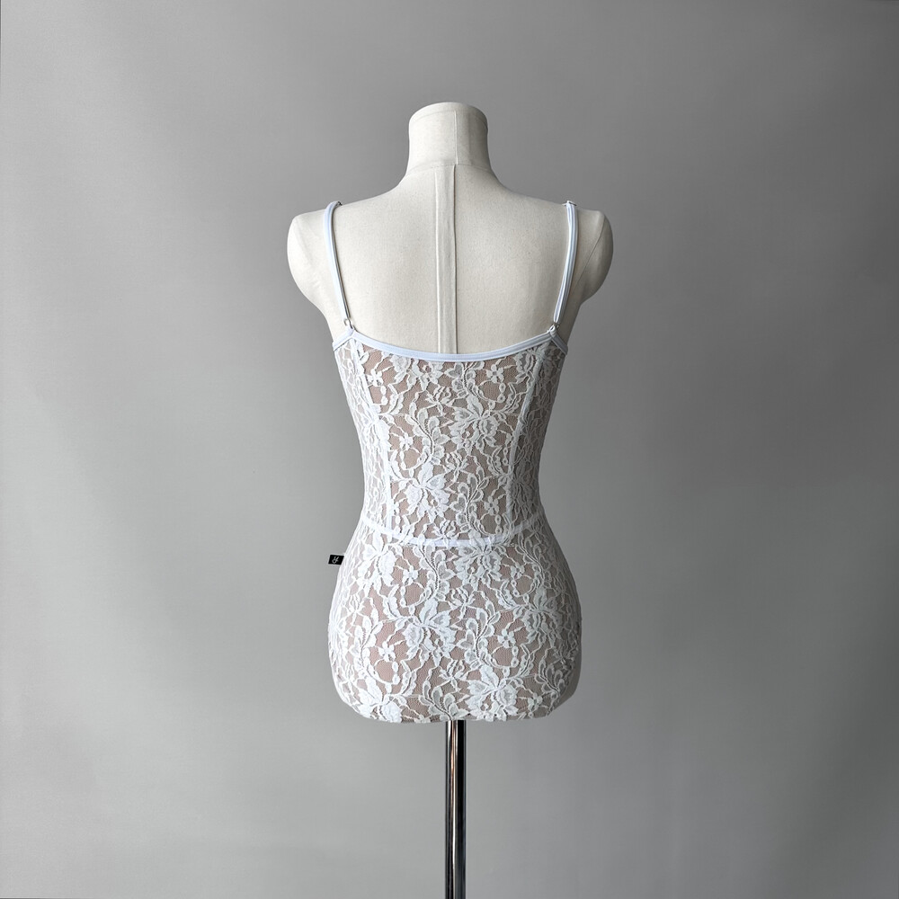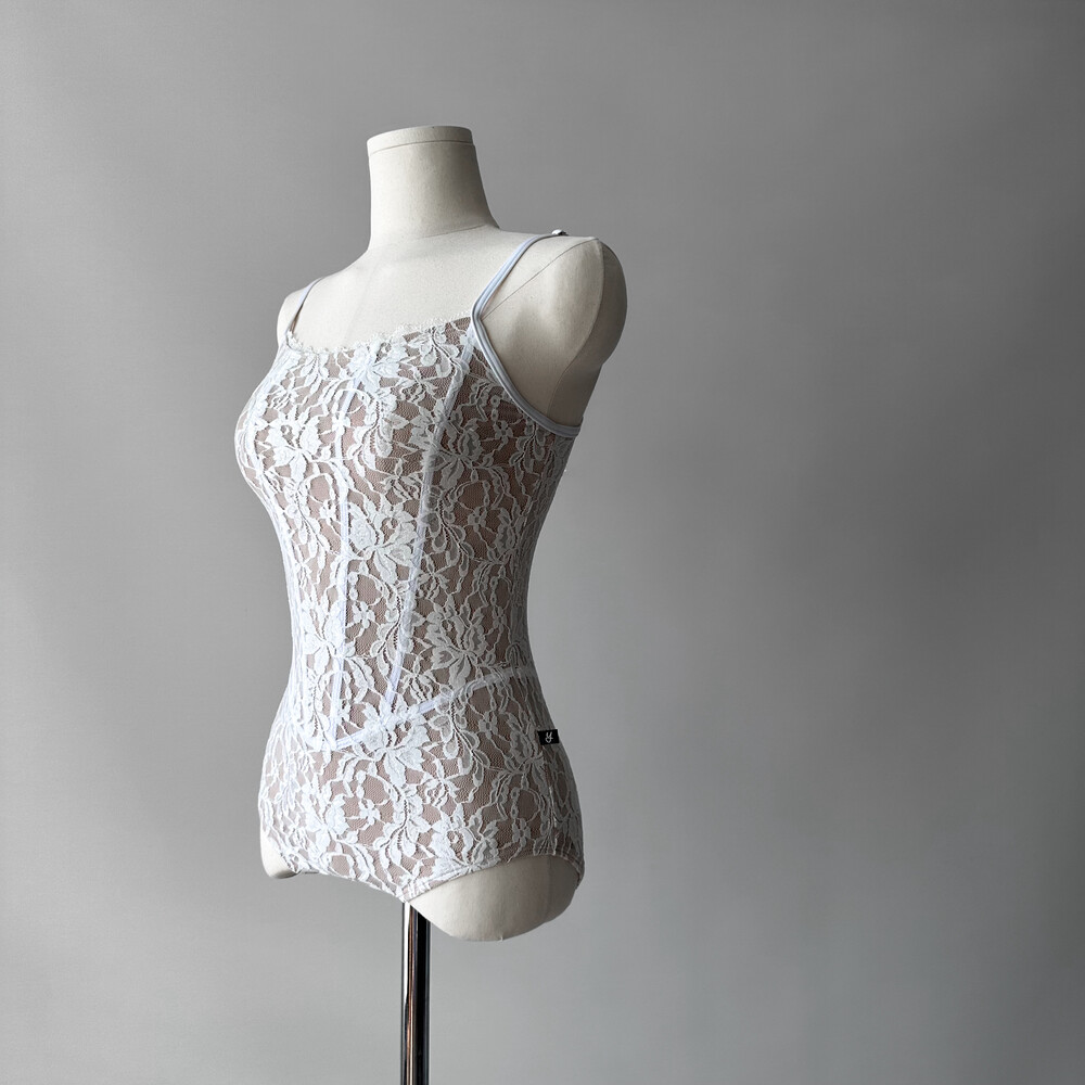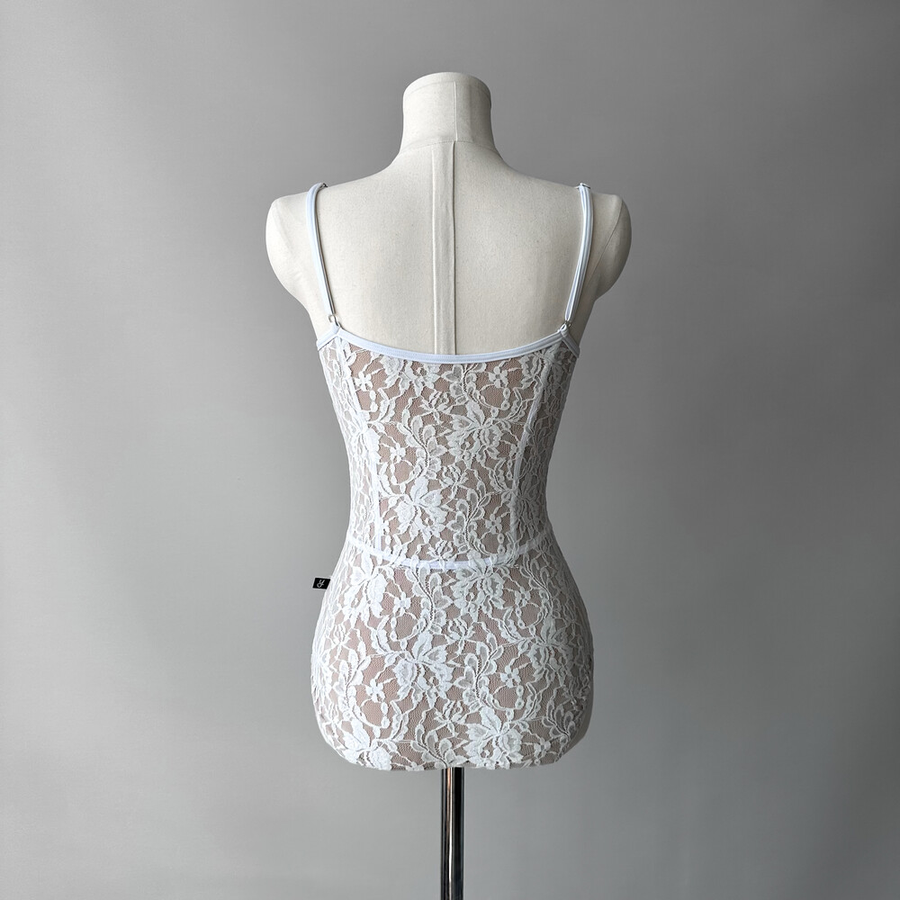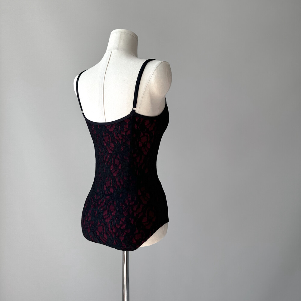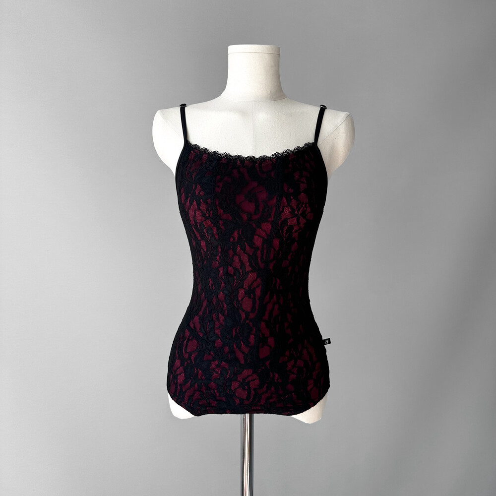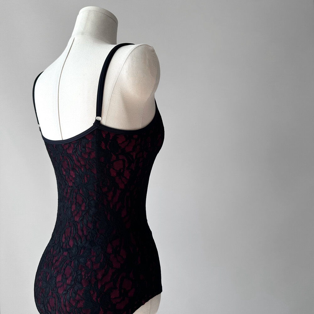 스칼렛 레오타드의 레이스는 장미꽃 패턴 사이사이로