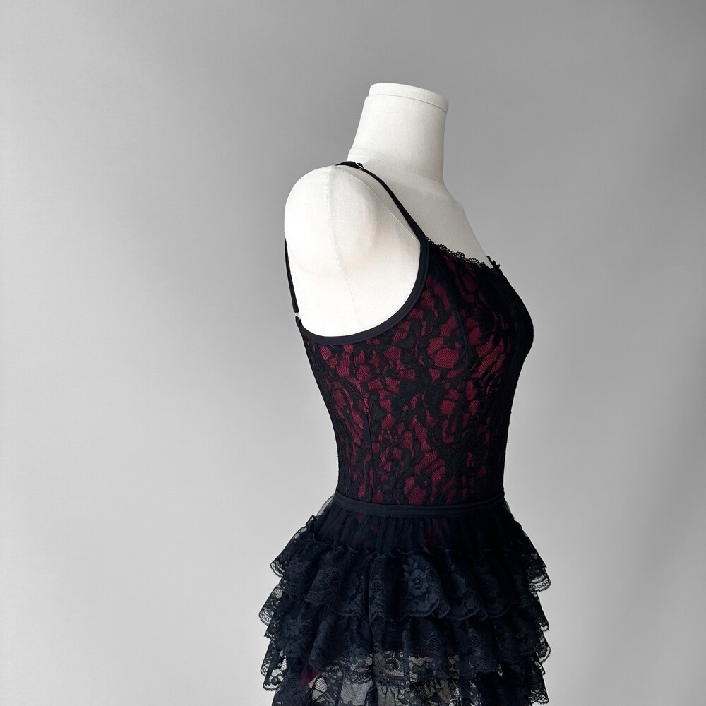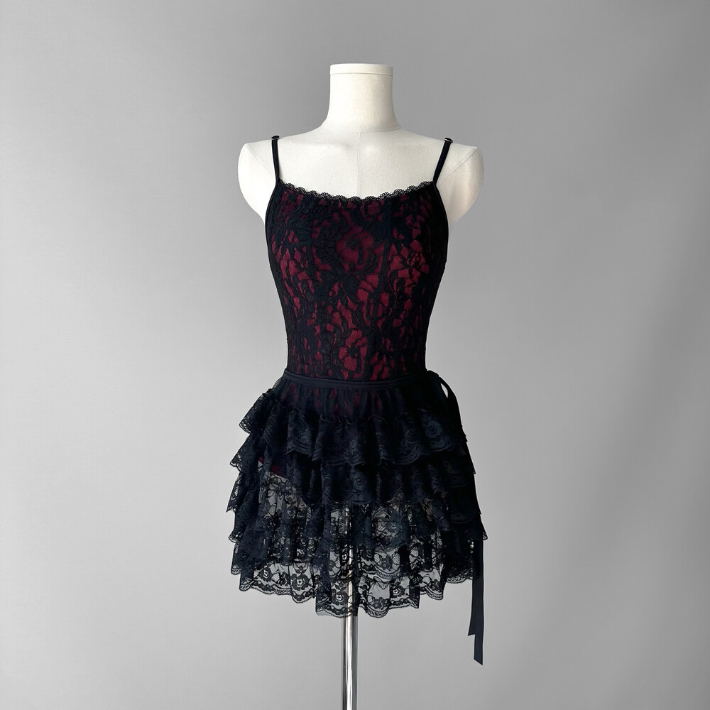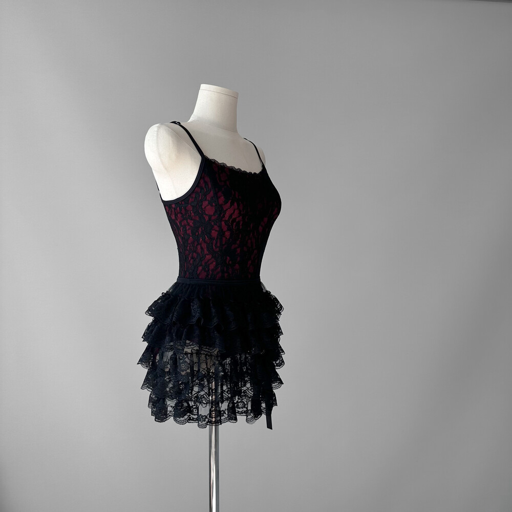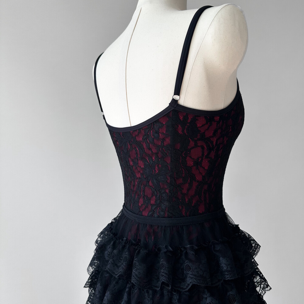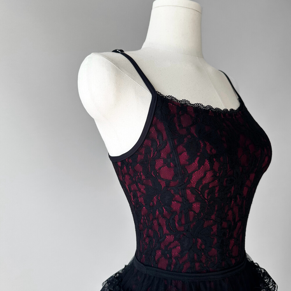 스칼렛 레오타드의 레이스는 장미꽃 패턴 사이사이로
