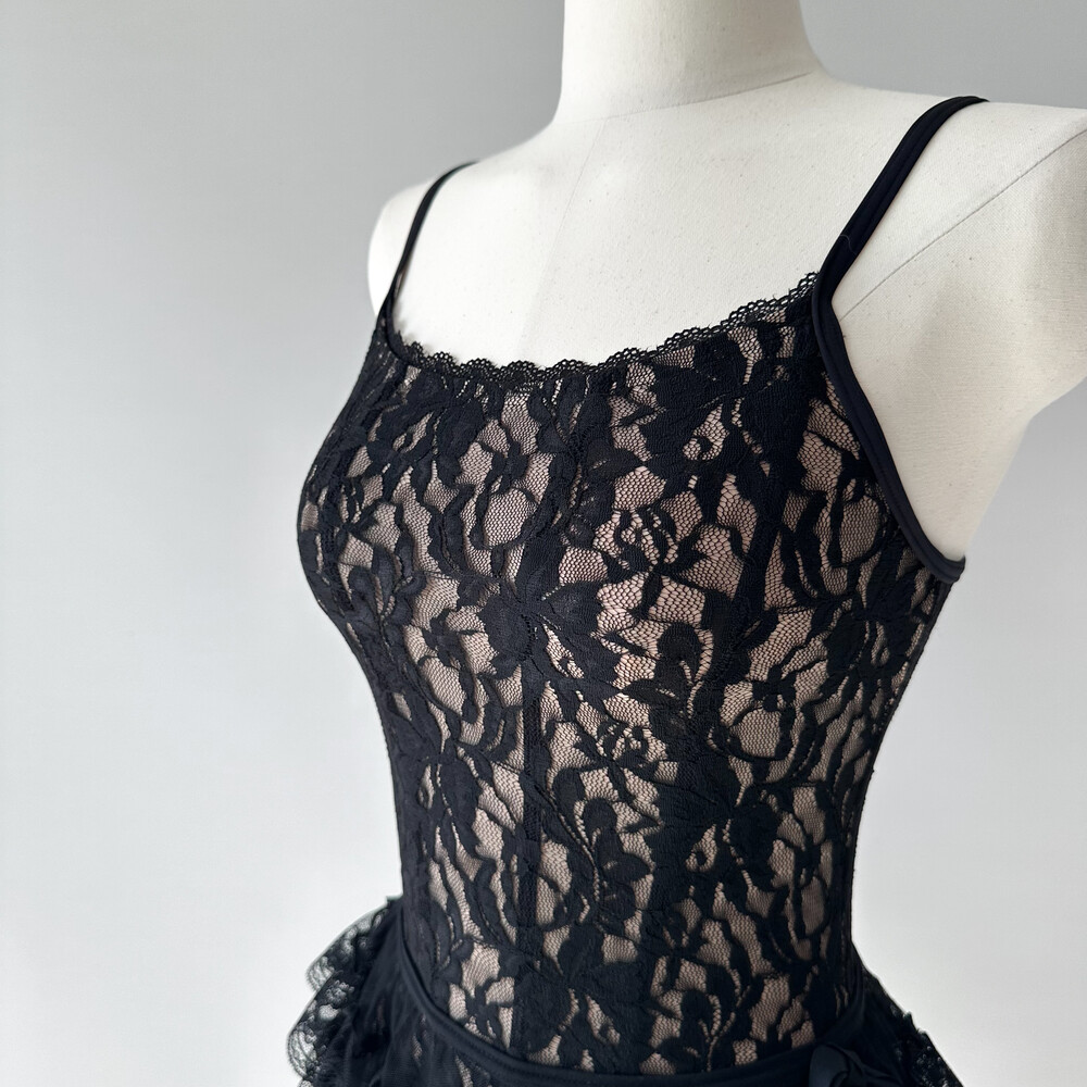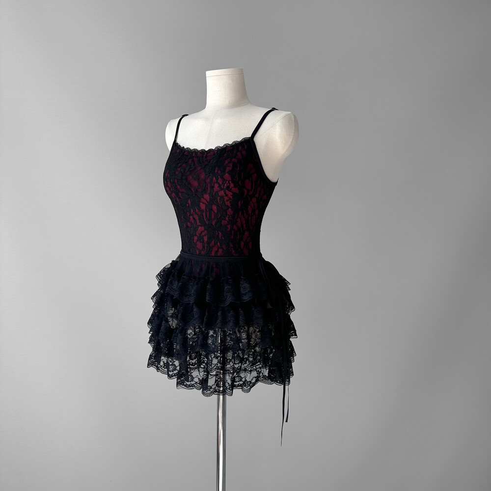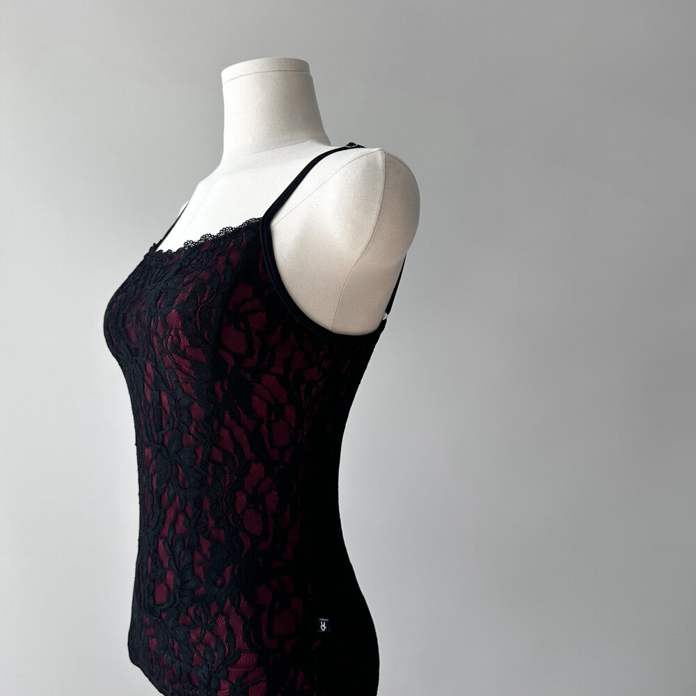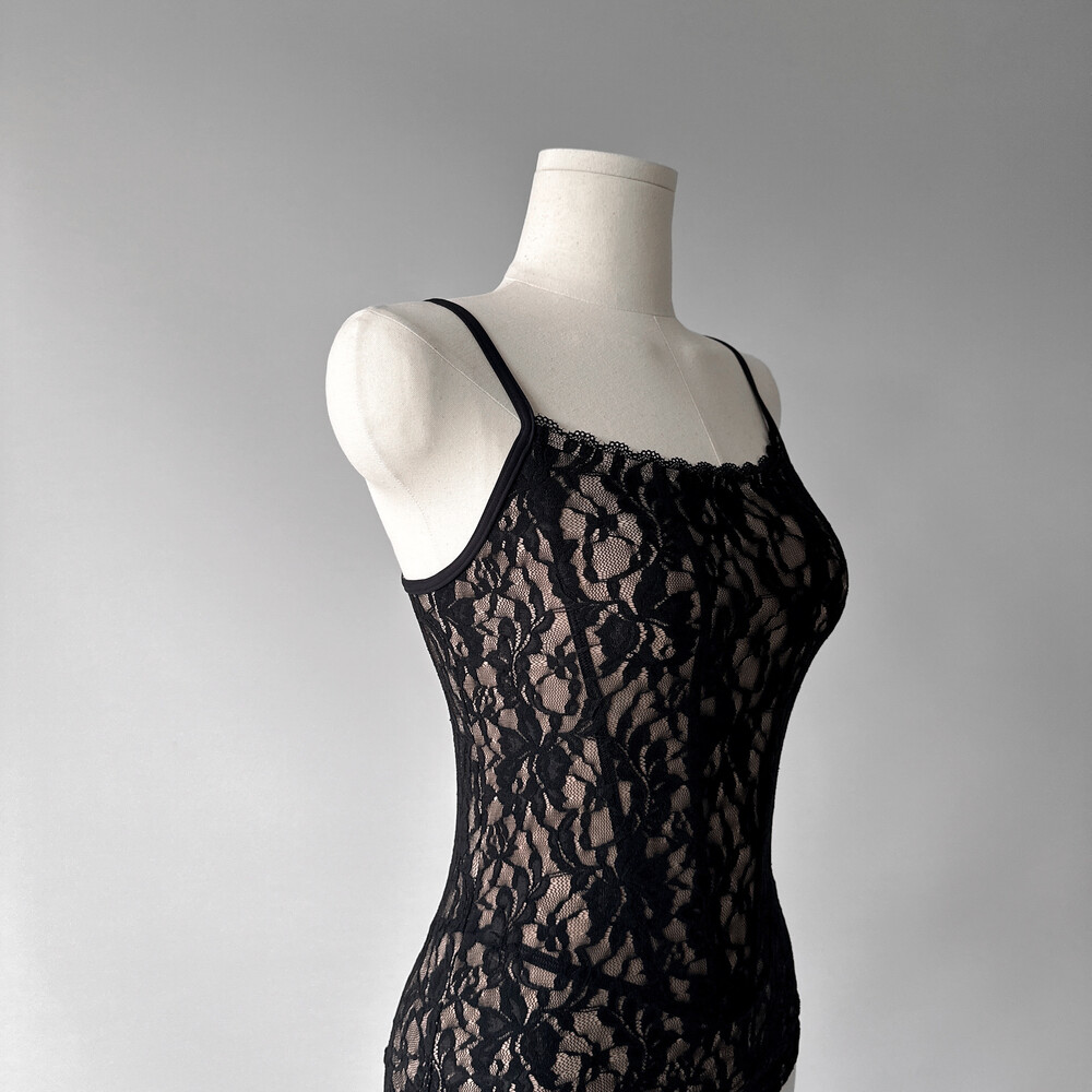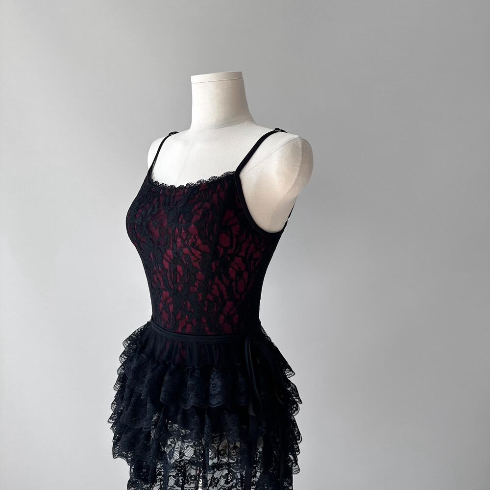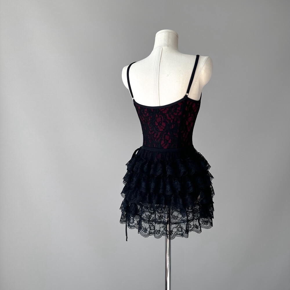 스칼렛 레오타드의 레이스는 장미꽃 패턴 사이사이로