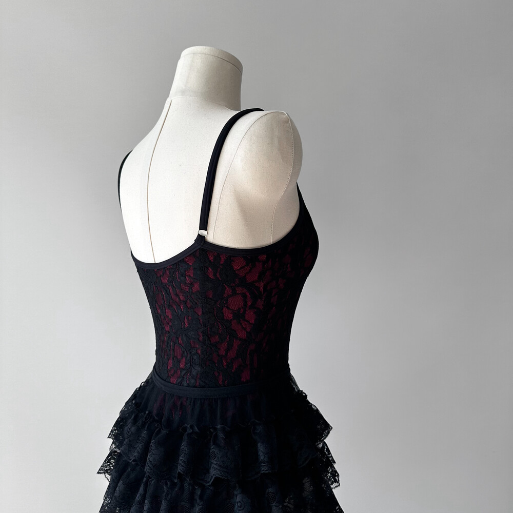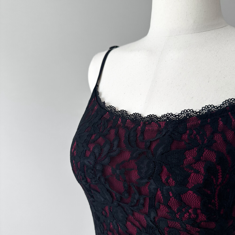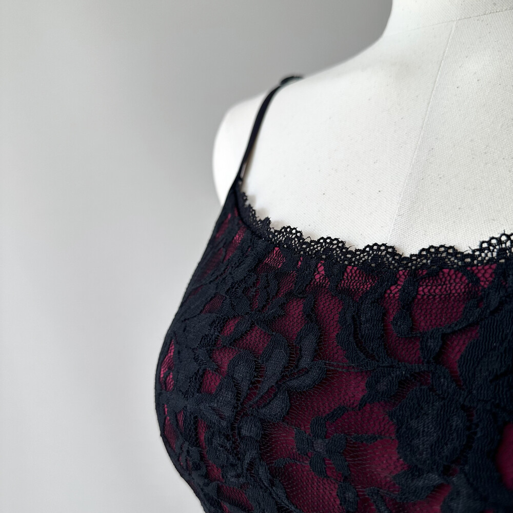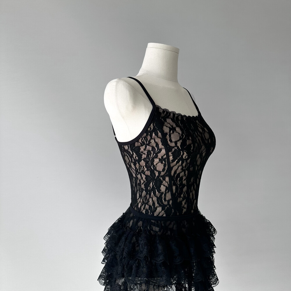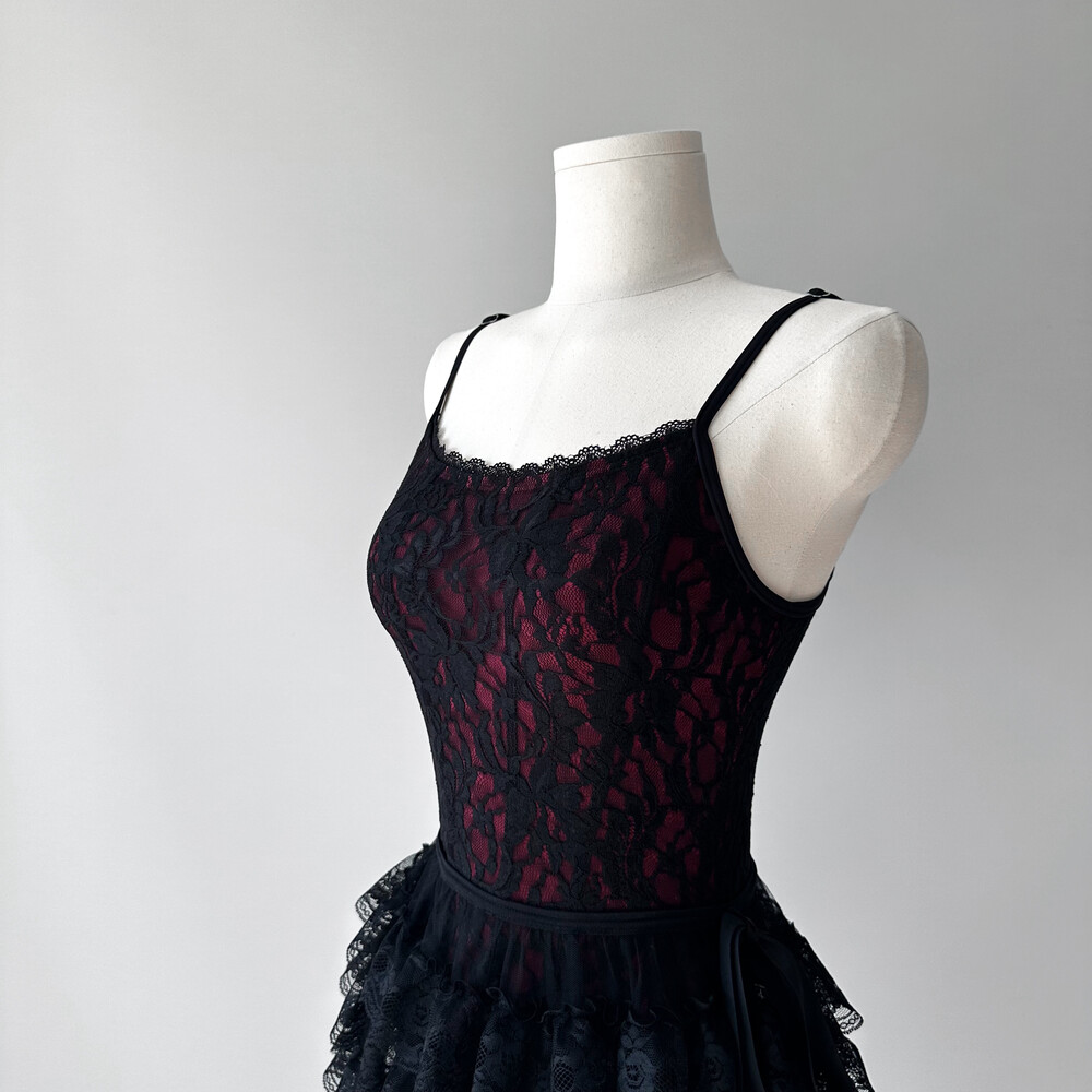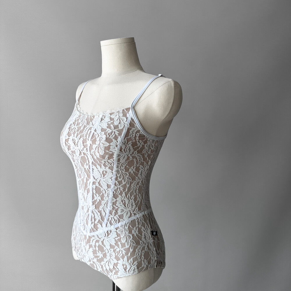 스칼렛 레오타드의 레이스는 장미꽃 패턴 사이사이로