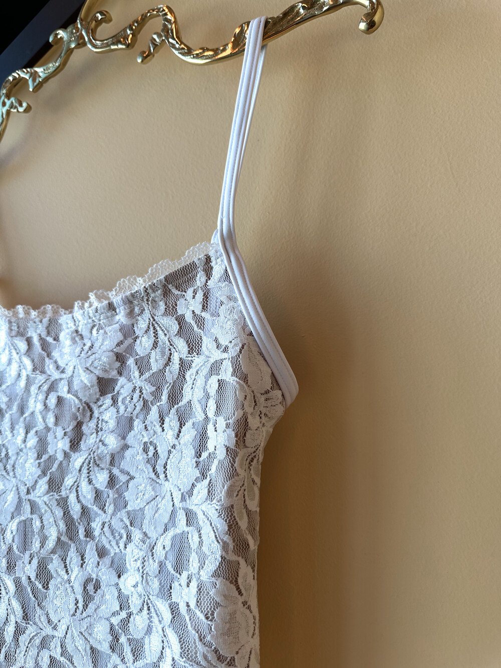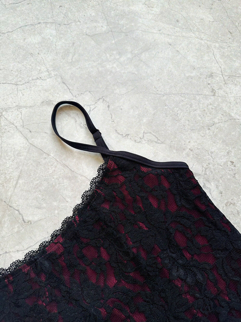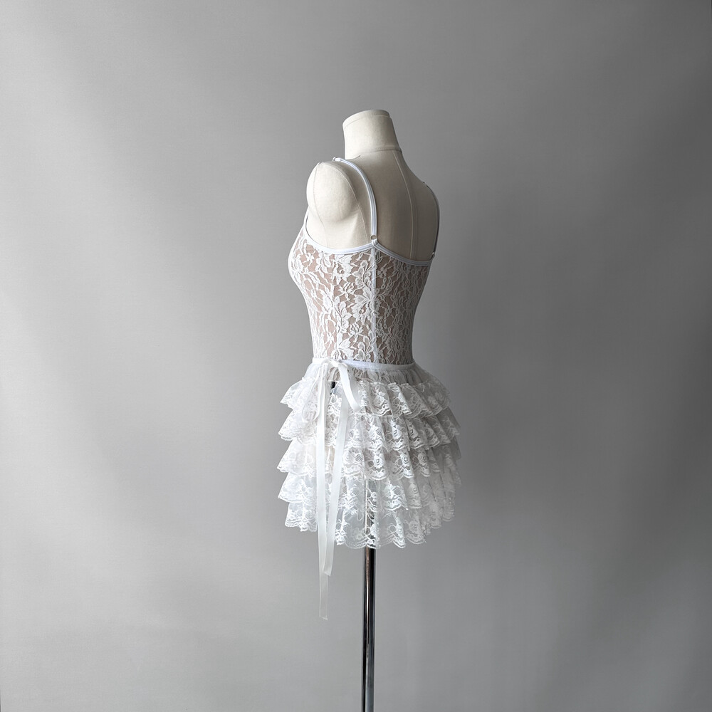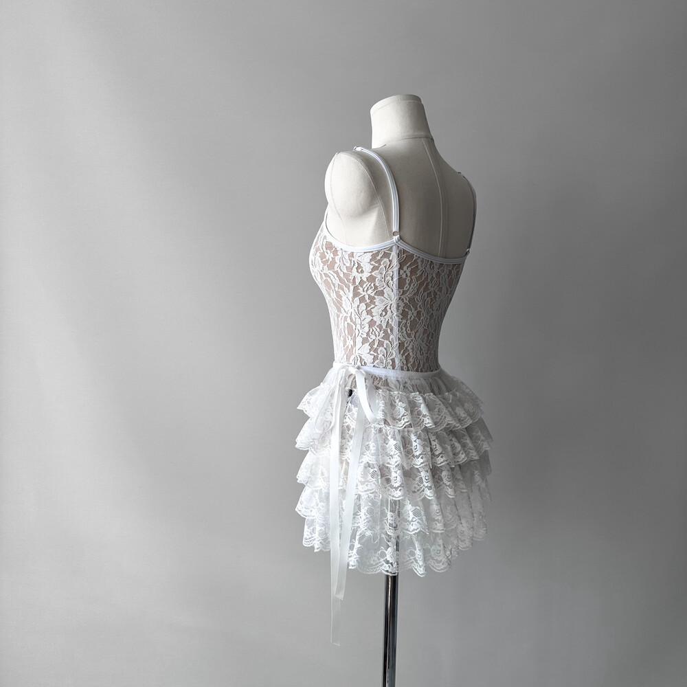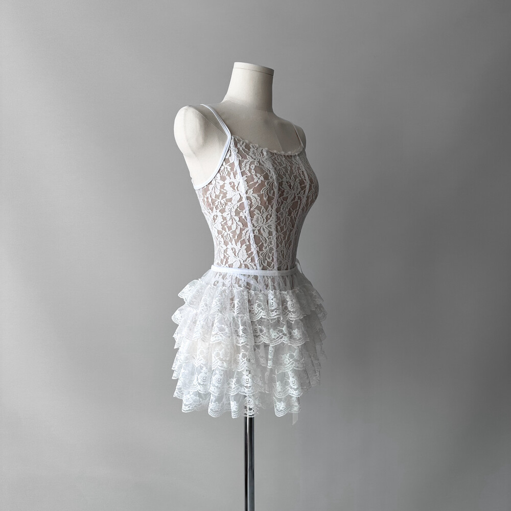 스칼렛 레오타드의 레이스는 장미꽃 패턴 사이사이로