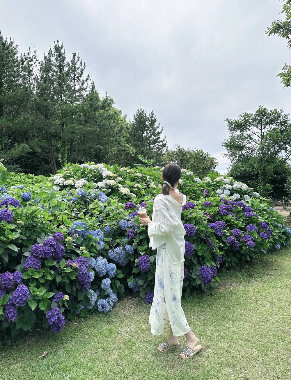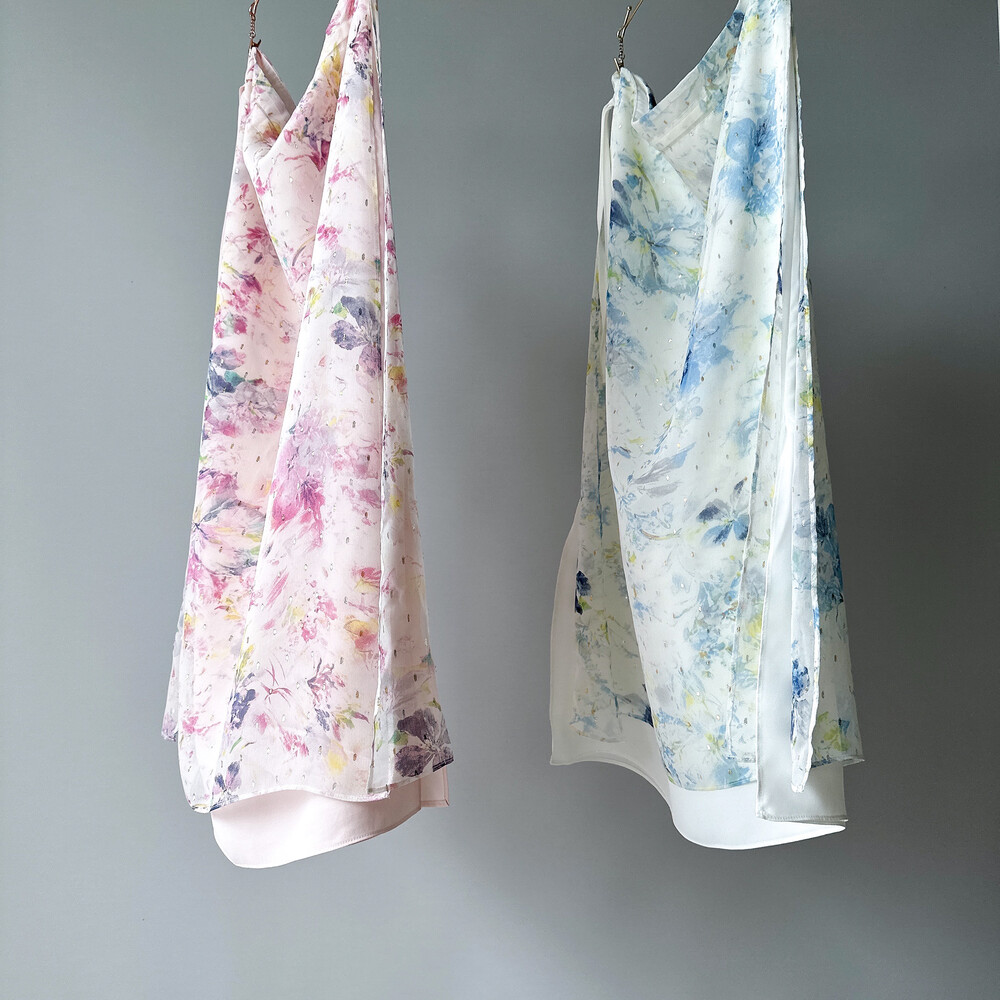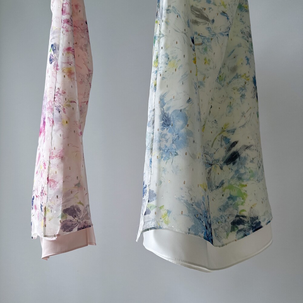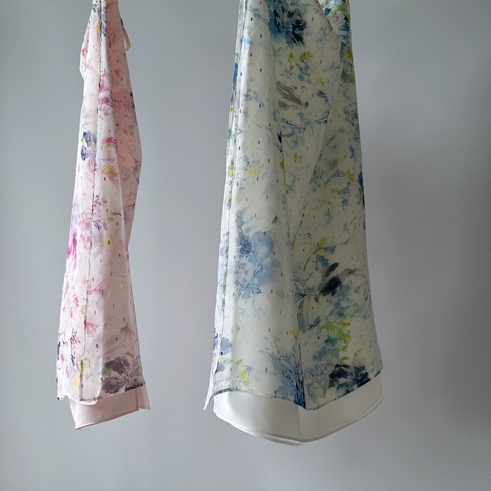 푸른 꽃무늬 요루쉬폰이 신비로운 무드를 연출합니다
