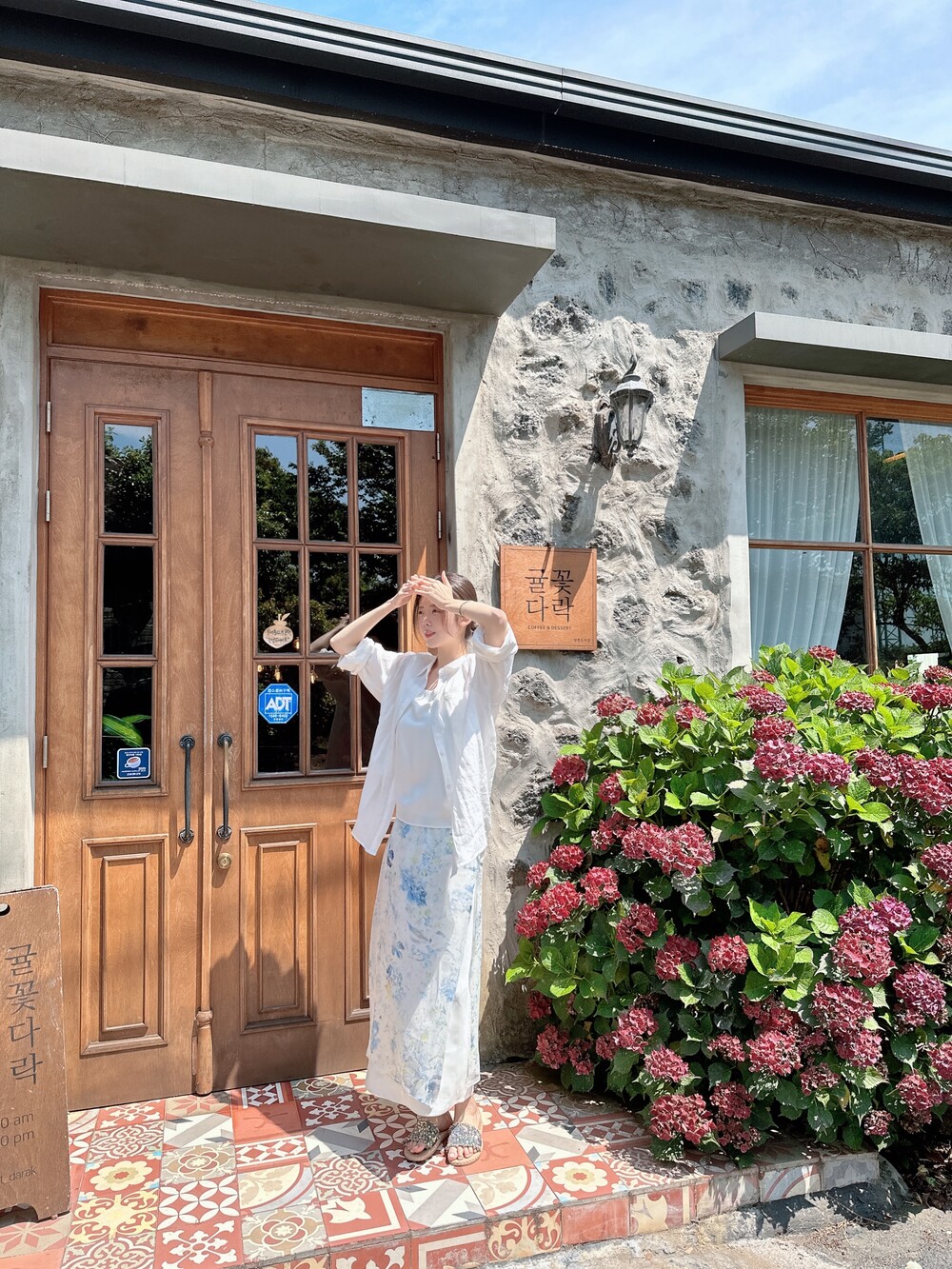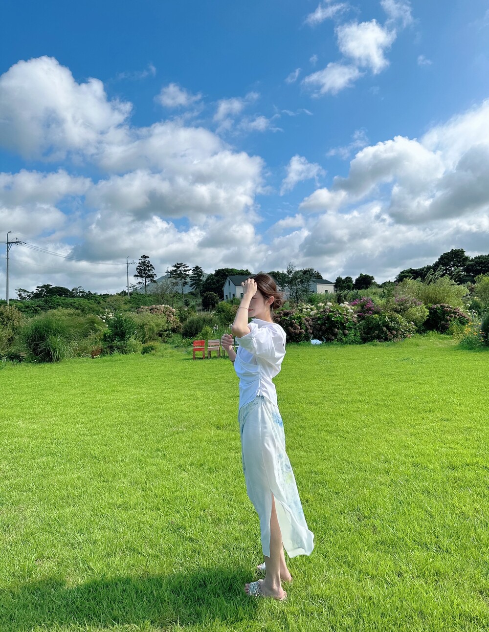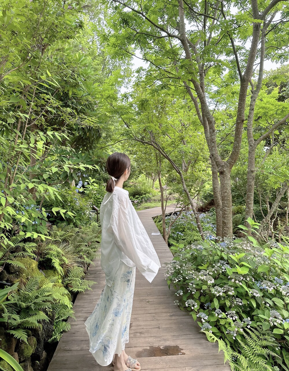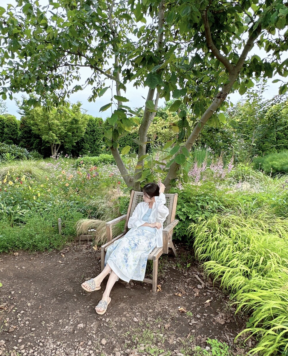 푸른 꽃무늬 요루쉬폰이 신비로운 무드를 연출합니다